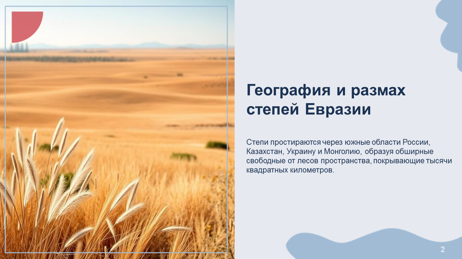 География и размах степей Евразии Степи простираются через южные области России, Казахстан, Украину и Монголию, образуя обширные свободные от лесов пространства, покрывающие тысячи квадратных километров.