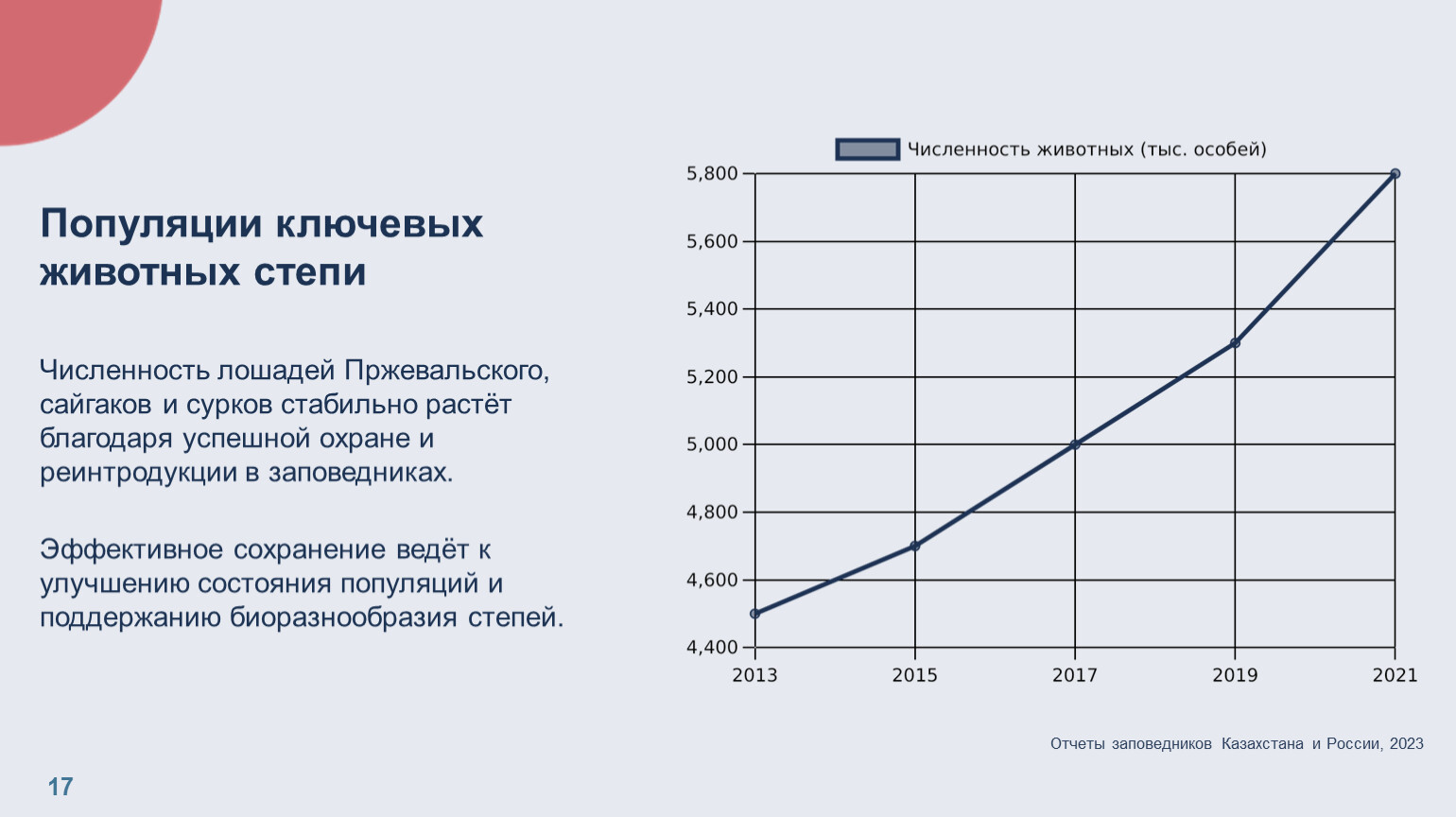 Популяции ключевых животных степи Численность лошадей Пржевальского, сайгаков и сурков стабильно растёт благодаря успешной охране и реинтродукции в заповедниках. Эффективное сохранение ведёт к улучшению состояния популяций и поддержанию биоразнообразия степей.