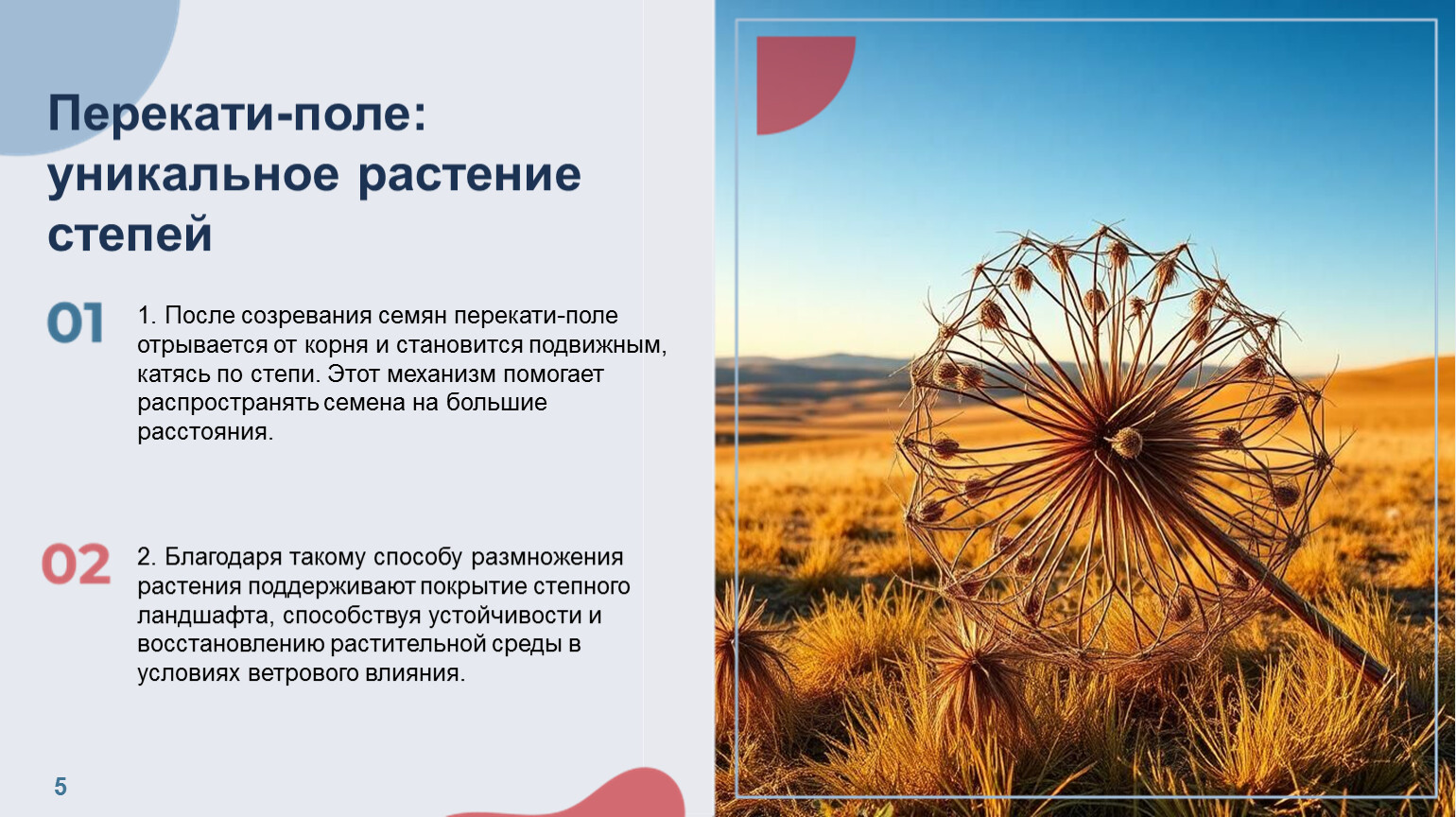 1. После созревания семян перекати-поле отрывается от корня и становится подвижным, катясь по степи. Этот механизм помогает распространять семена на большие расстояния.