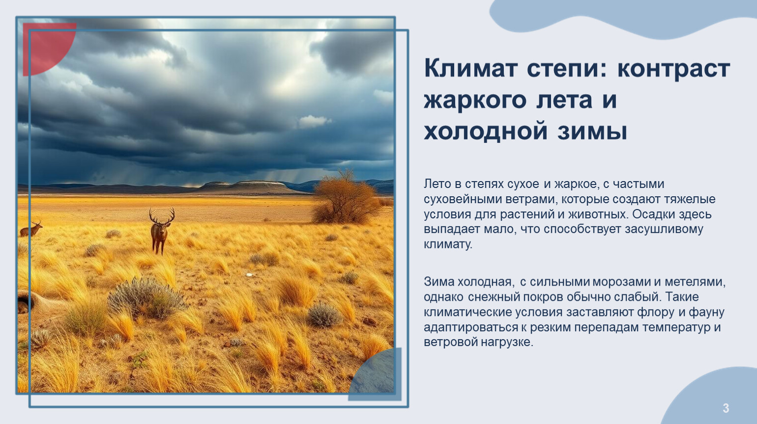 Климат степи: контраст жаркого лета и холодной зимы Лето в степях сухое и жаркое, с частыми суховейными ветрами, которые создают тяжелые условия для растений и животных. Осадки здесь выпадает мало, что способствует засушливому климату. Зима холодная, с сильными морозами и метелями, однако снежный покров обычно слабый. Такие климатические условия заставляют флору и фауну адаптироваться к резким перепадам температур и ветровой нагрузке.