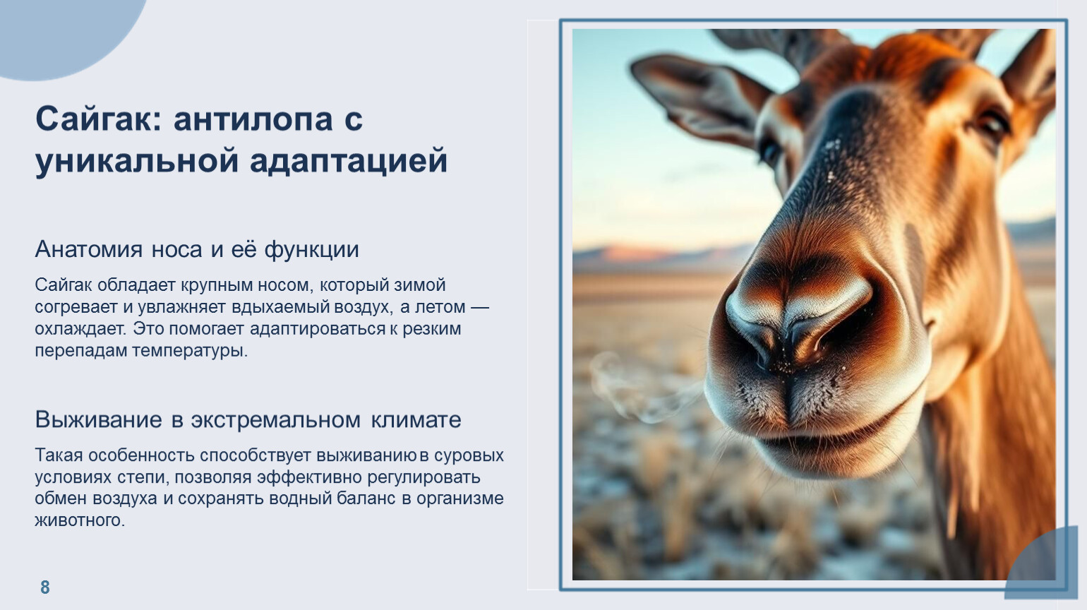 Сайгак оснащён крупным носом, который помогает согревать и увлажнять воздух зимой и охлаждать летом, обеспечивая выживание в экстремально изменчивом климате степей.