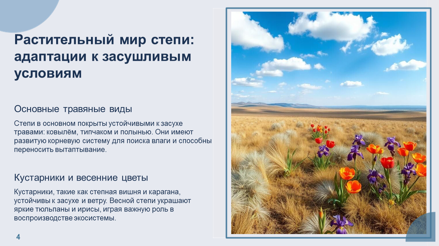 Растительный мир степи: адаптации к засушливым условиям Основные травяные виды Степи в основном покрыты устойчивыми к засухе травами: ковылём, типчаком и полынью. Они имеют развитую корневую систему для поиска влаги и способны переносить вытаптывание. Кустарники и весенние цветы Кустарники, такие как степная вишня и карагана, устойчивы к засухе и ветру. Весной степи украшают яркие тюльпаны и ирисы, играя важную роль в воспроизводстве экосистемы.