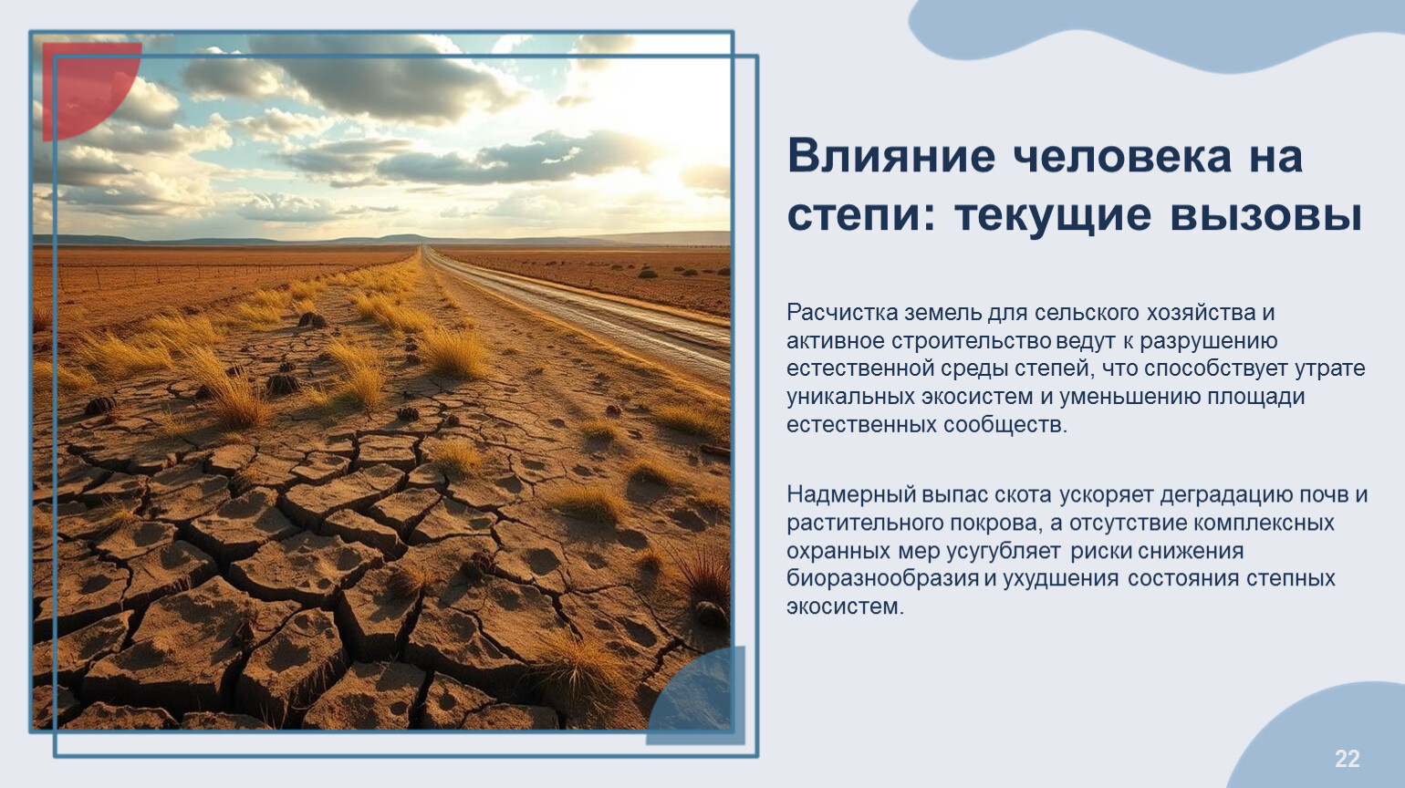 Влияние человека на степи: текущие вызовы Расчистка земель для сельского хозяйства и активное строительство ведут к разрушению естественной среды степей, что способствует утрате уникальных экосистем и уменьшению площади естественных сообществ. Надмерный выпас скота ускоряет деградацию почв и растительного покрова, а отсутствие комплексных охранных мер усугубляет риски снижения биоразнообразия и ухудшения состояния степных экосистем.