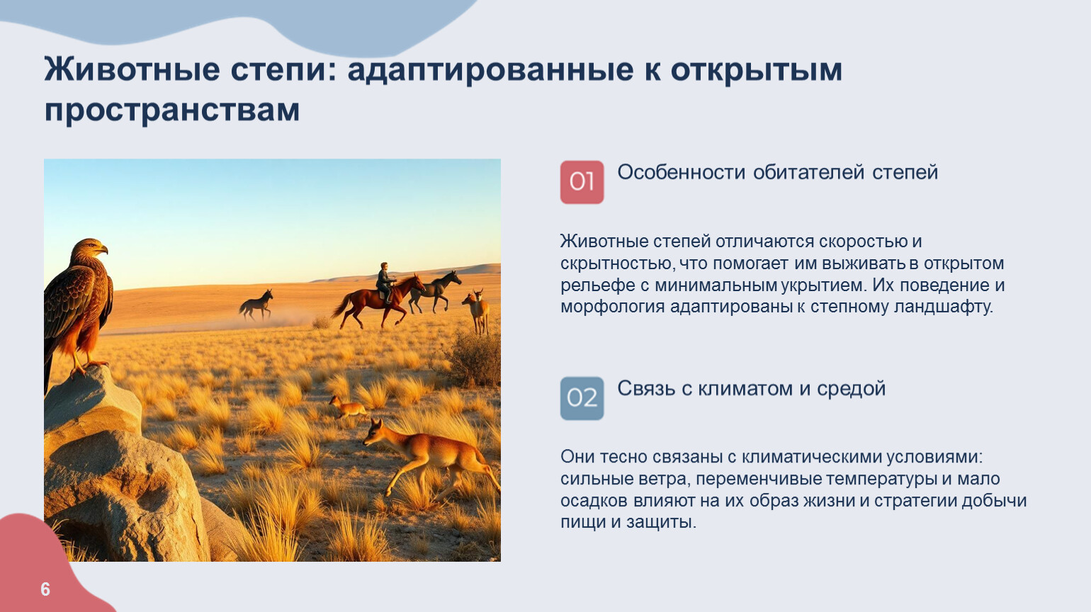 Животные степи развили способность оперативно адаптироваться к переменам погоды и доступности ресурсов, что повышает их шансы на выживание в условиях непредсказуемого климата.