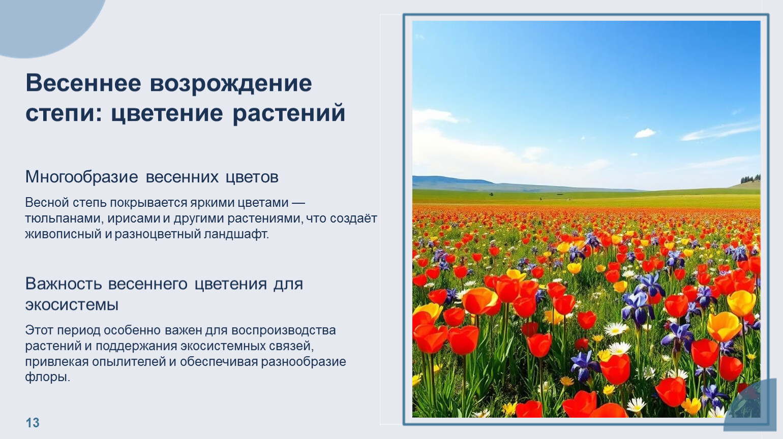 Весеннее возрождение степи: цветение растений Многообразие весенних цветов Весной степь покрывается яркими цветами — тюльпанами, ирисами и другими растениями, что создаёт живописный и разноцветный ландшафт. Важность весеннего цветения для экосистемы Этот период особенно важен для воспроизводства растений и поддержания экосистемных связей, привлекая опылителей и обеспечивая разнообразие флоры.