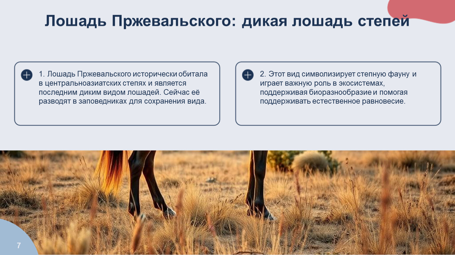 1. Лошадь Пржевальского исторически обитала в центральноазиатских степях и является последним диким видом лошадей. Сейчас её разводят в заповедниках для сохранения вида.