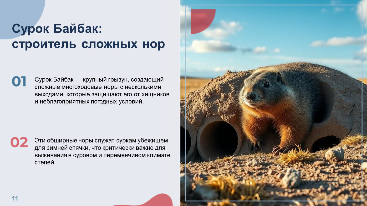 Сурок Байбак — крупный грызун, создающий сложные многоходовые норы с несколькими выходами, которые защищают его от хищников и неблагоприятных погодных условий.