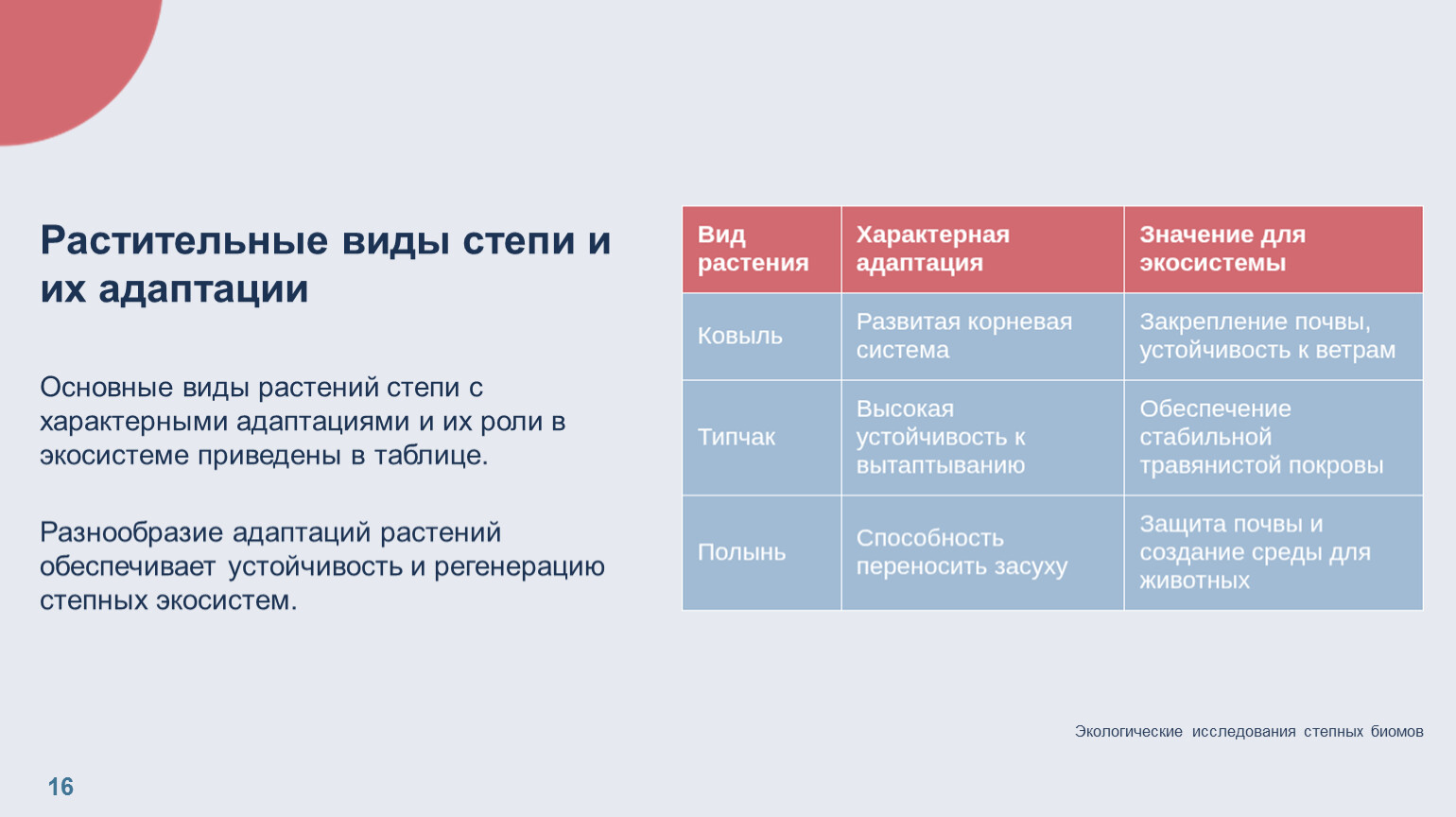 Растительные виды степи и их адаптации Основные виды растений степи с характерными адаптациями и их роли в экосистеме приведены в таблице. Разнообразие адаптаций растений обеспечивает устойчивость и регенерацию степных экосистем.