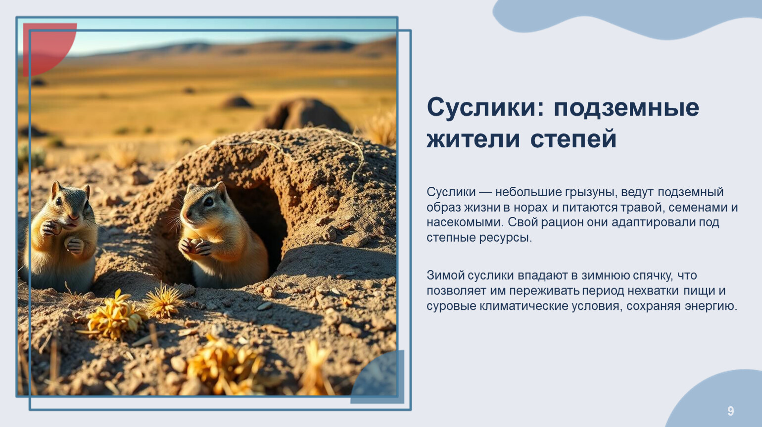 Суслики: подземные жители степей Суслики — небольшие грызуны, ведут подземный образ жизни в норах и питаются травой, семенами и насекомыми. Свой рацион они адаптировали под степные ресурсы. Зимой суслики впадают в зимнюю спячку, что позволяет им переживать период нехватки пищи и суровые климатические условия, сохраняя энергию.