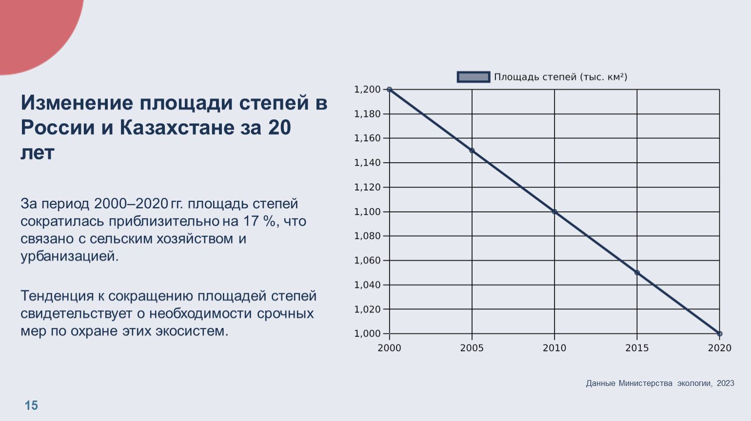 Изменение площади степей в России и Казахстане за 20 лет За период 2000–2020 гг. площадь степей сократилась приблизительно на 17 %, что связано с сельским хозяйством и урбанизацией. Тенденция к сокращению площадей степей свидетельствует о необходимости срочных мер по охране этих экосистем.
