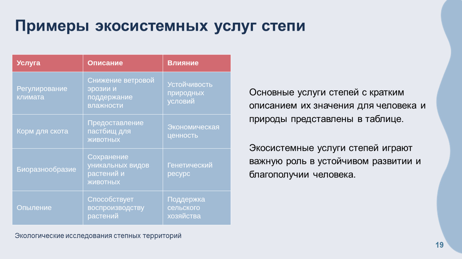 Основные услуги степей с кратким описанием их значения для человека и природы представлены в таблице. Экосистемные услуги степей играют важную роль в устойчивом развитии и благополучии человека.