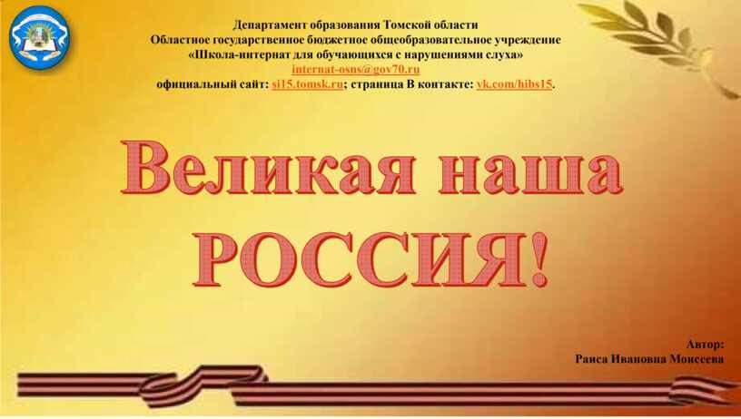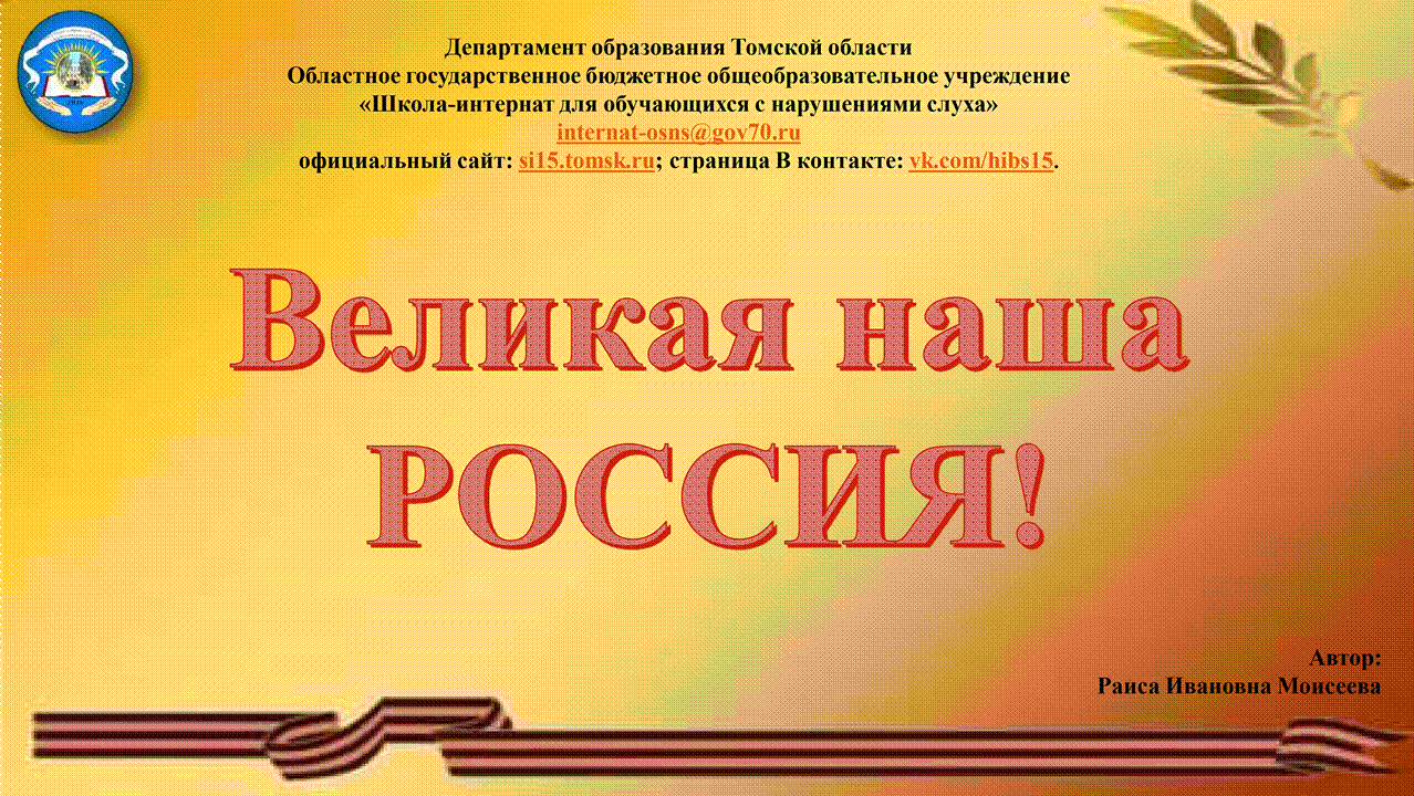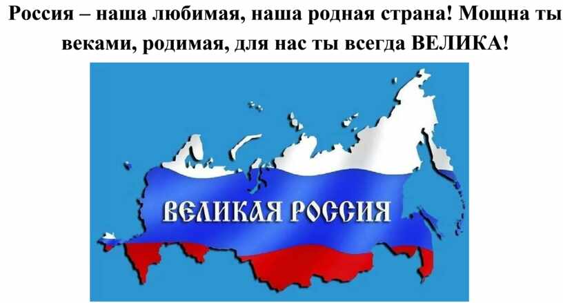 Россия – наша любимая, наша родная страна! Мощна ты веками, родимая, для нас ты всегда ВЕЛИКА!