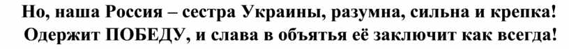 Но, наша Россия – сестра Украины, разумна, сильна и крепка! Одержит ПОБЕДУ, и слава в объятья её заключит как всегда!