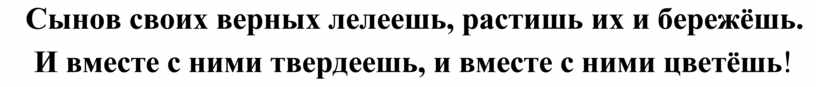 Сынов своих верных лелеешь, растишь их и бережёшь. И вместе с ними твердеешь, и вместе с ними цветёшь!