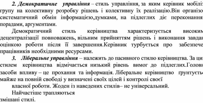 майже на повній свободі у визначені своїх цілей і контролі своєї власної роботи. Жоден із наведених стилів– не універсальний. Найчастіше трапляються