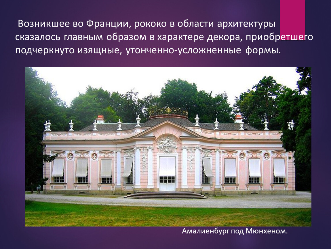 Возникшее во Франции, рококо в области архитектуры сказалось главным образом в характере декора, приобретшего подчеркнуто изящные, утонченно-усложненные формы.