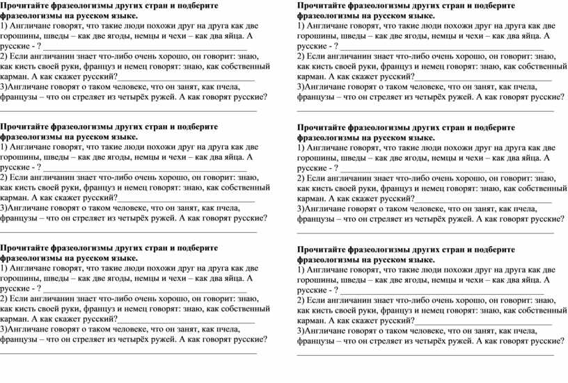 Прочитайте фразеологизмы других стран и подберите фразеологизмы на русском языке.