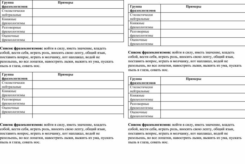 Список фразеологизмов: войти в силу, иметь значение, владеть собой, вести себя, играть роль, вносить свою лепту, общий язык, поставить вопрос, играть в молчанку, кот наплакал, водой не разольешь, во все лопатки, навострить лыжи, выжить из ума, пускать пыль в глаза, совать нос.