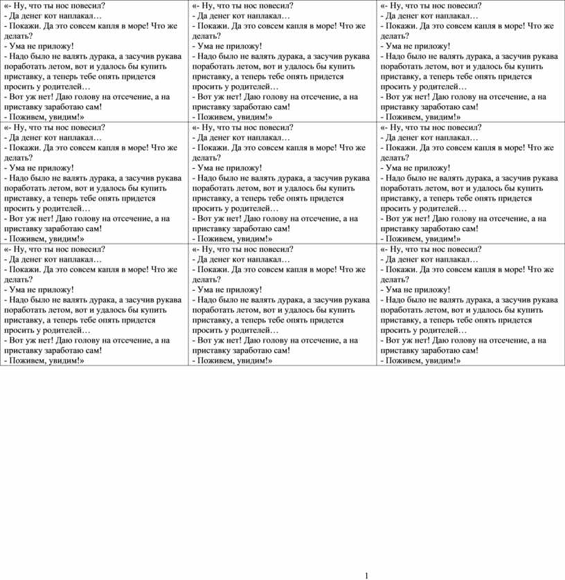 «- Ну, что ты нос повесил? - Да денег кот наплакал… - Покажи. Да это совсем капля в море! Что же делать? - Ума не приложу! - Надо было не валять дурака, а засучив рукава поработать летом, вот и удалось бы купить приставку, а теперь тебе опять придется просить у родителей… - Вот уж нет! Даю голову на отсечение, а на приставку заработаю сам! - Поживем, увидим!» (на партах у каждого ученика листочки с распечатанным диалогом)