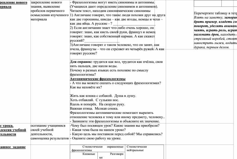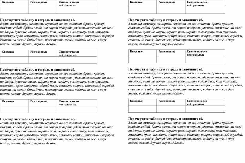 Перечертите таблицу в тетрадь и заполните её. Взять на заметку, заморить червячка, во все лопатки, брать пример, владеть собой, брать слово, от ворот поворот, уделять внимание, ни кола ни двора, души не чаять, играть роль, играть в молчанку, кот наплакал, наломать дров, находить общий язык, ставить вопрос, стреляный воробей, стоять на своём, битый час, навострить лыжи, водить за нос, в двух шагах, валять дурака, первым делом. |
