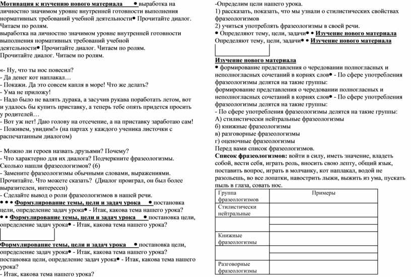 Цель урока: 1) ученик усвоит стилистические свойства фразеологизмов и будет использовать их в речи в соответствии со стилем речи;