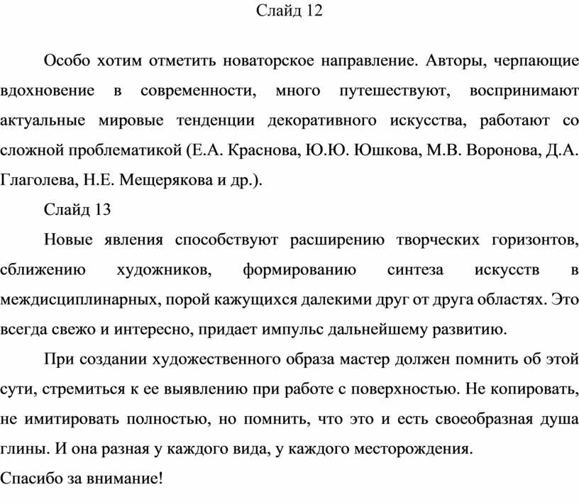 Особо хотим отметить новаторское направление. Авторы, черпающие вдохновение в современности, много путешествуют, воспринимают актуальные мировые тенденции декоративного искусства, работают со сложной проблематикой (Е.А. Краснова, Ю.Ю. Юшкова, М.В. Воронова, Д.А. Глаголева, Н.Е. Мещерякова и др.).