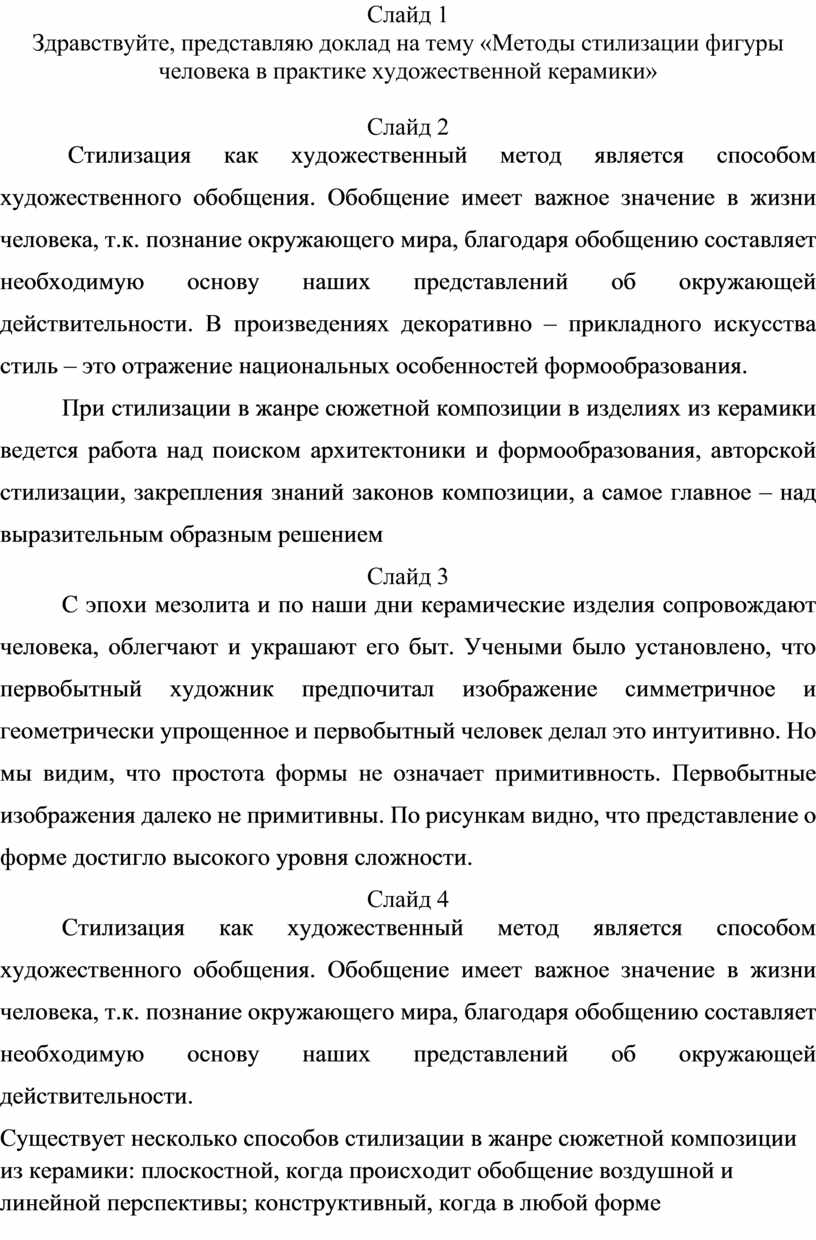 Здравствуйте, представляю доклад на тему «Методы стилизации фигуры человека в практике художественной керамики»