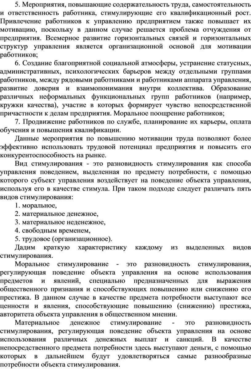 5. Мероприятия, повышающие содержательность труда, самостоятельность и ответственность работника, стимулирующие его квалификационный рост. Привлечение работников к управлению предприятием также повышает их мотивацию, поскольку в данном случае решается проблема отчуждения от предприятия. Всемерное развитие горизонтальных связей и горизонтальных структур управления является организационной основой для мотивации работников;