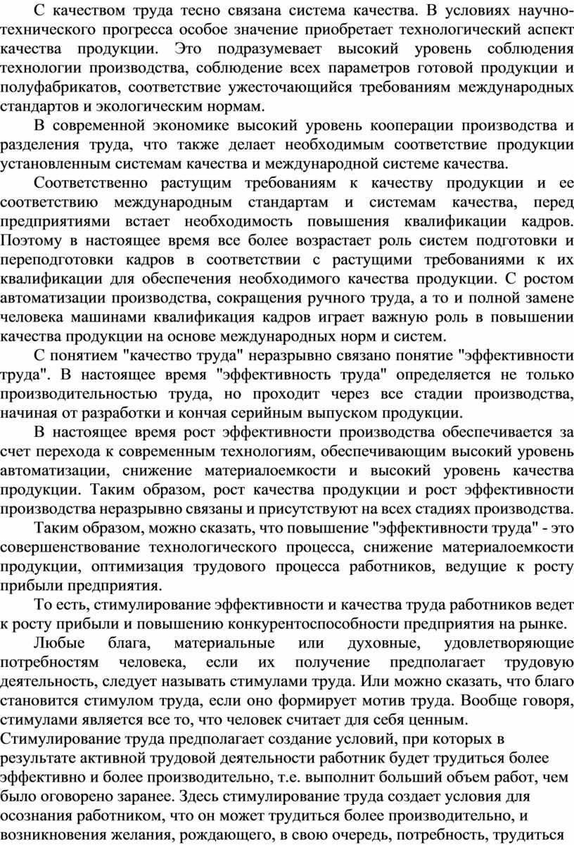 С понятием "качество труда" неразрывно связано понятие "эффективности труда". В настоящее время "эффективность труда" определяется не только производительностью труда, но проходит через все стадии производства, начиная от разработки и кончая серийным выпуском продукции.