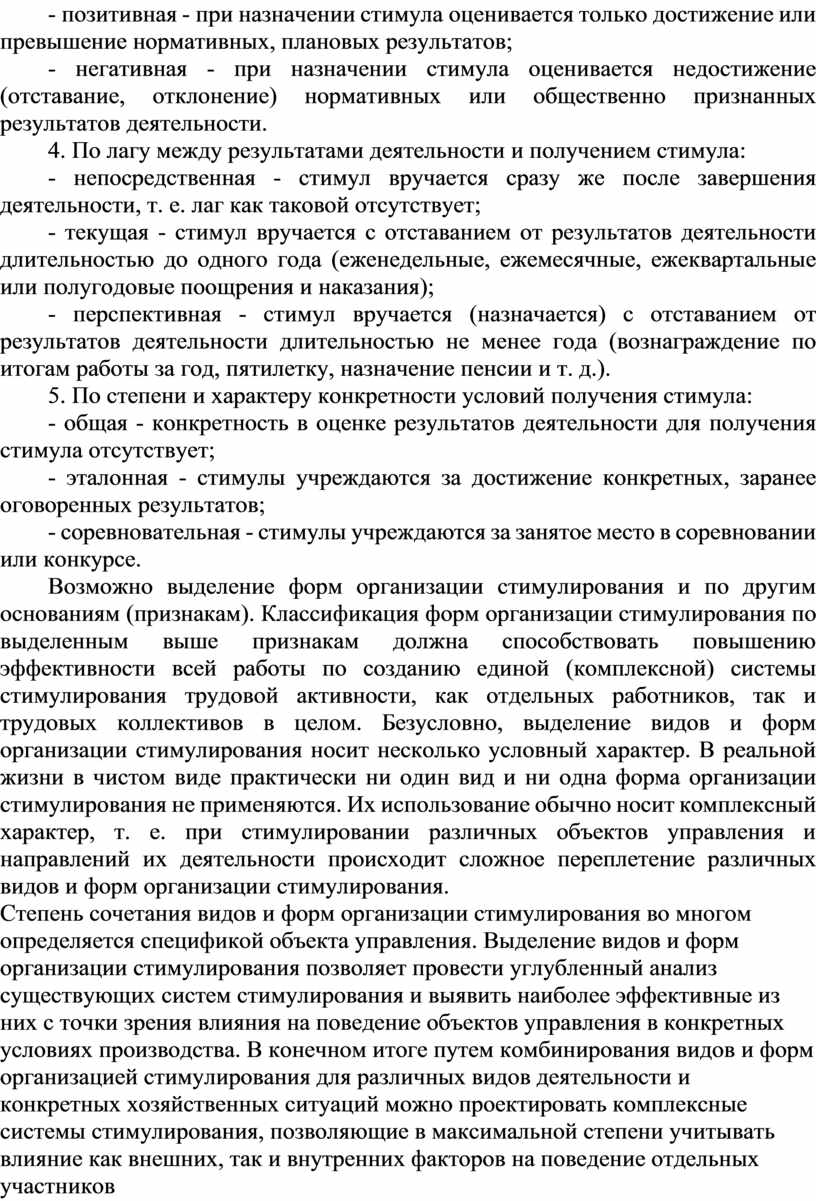 Возможно выделение форм организации стимулирования и по другим основаниям (признакам). Классификация форм организации стимулирования по выделенным выше признакам должна способствовать повышению эффективности всей работы по созданию единой (комплексной) системы стимулирования трудовой активности, как отдельных работников, так и трудовых коллективов в целом. Безусловно, выделение видов и форм организации стимулирования носит несколько условный характер. В реальной жизни в чистом виде практически ни один вид и ни одна форма организации стимулирования не применяются. Их использование обычно носит комплексный характер, т. е. при стимулировании различных объектов управления и направлений их деятельности происходит сложное переплетение различных видов и форм организации стимулирования.