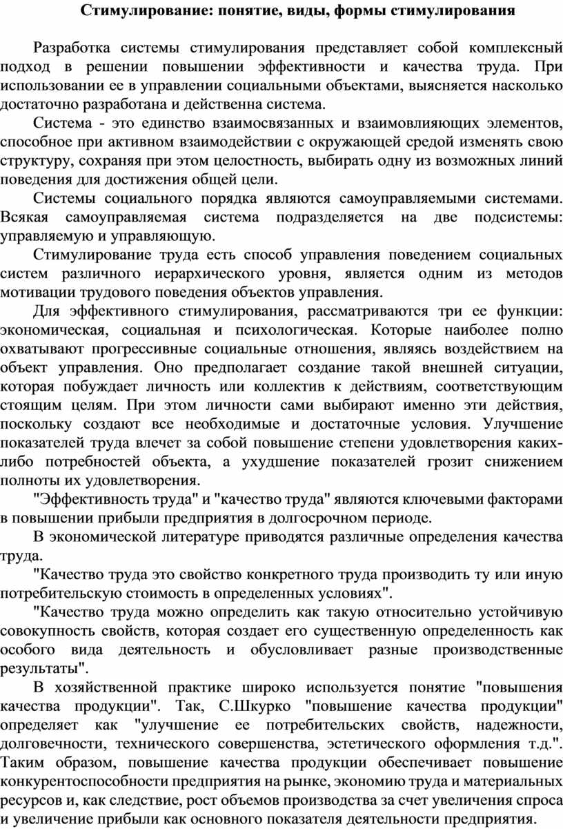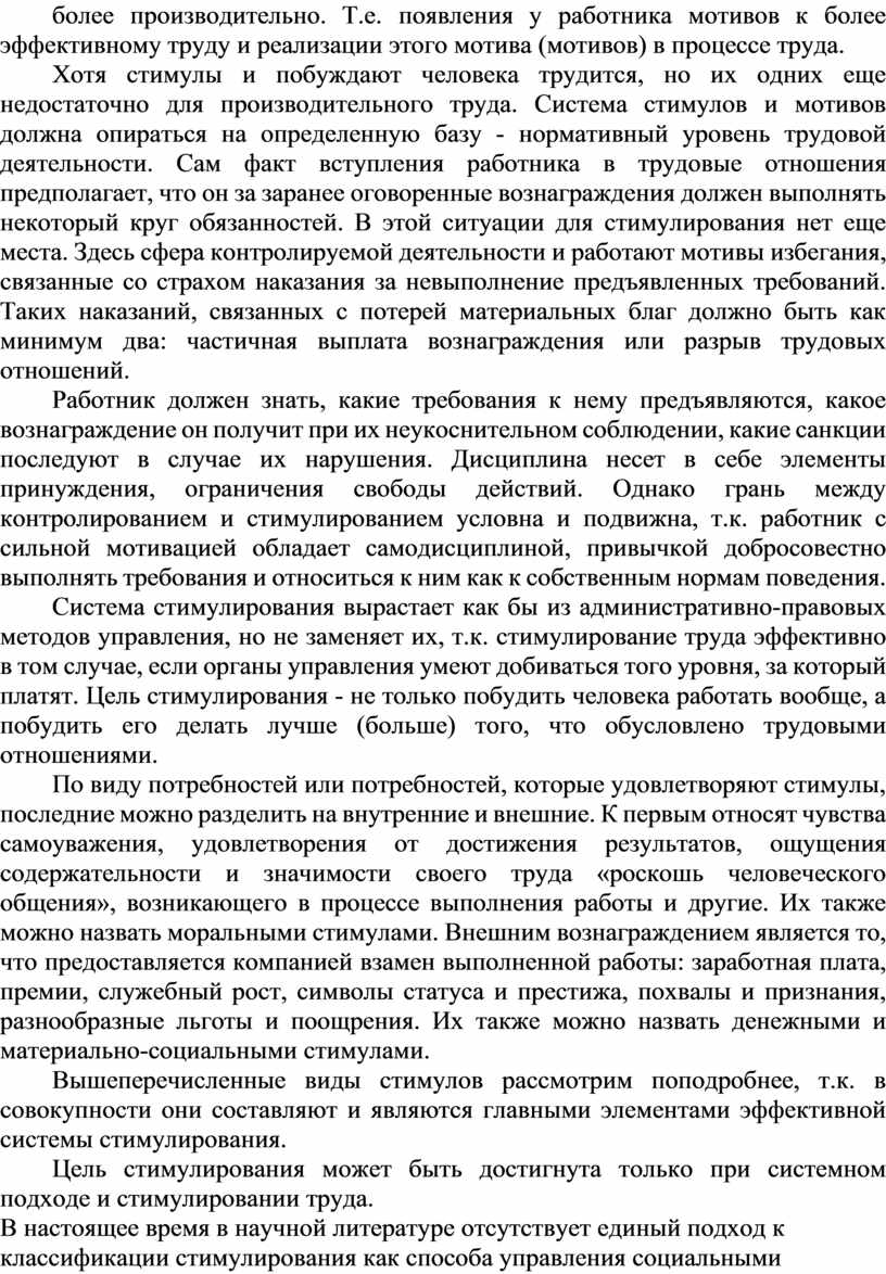 Стимулирование труда есть способ управления поведением социальных систем различного иерархического уровня, является одним из методов мотивации трудового поведения объектов управления.