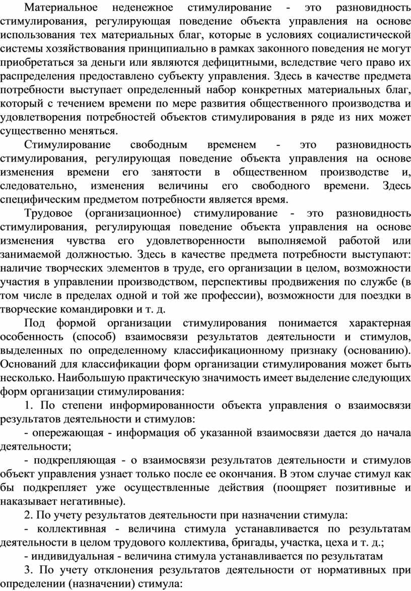 Материальное неденежное стимулирование - это разновидность стимулирования, регулирующая поведение объекта управления на основе использования тех материальных благ, которые в условиях социалистической системы хозяйствования принципиально в рамках законного поведения не могут приобретаться за деньги или являются дефицитными, вследствие чего право их распределения предоставлено субъекту управления. Здесь в качестве предмета потребности выступает определенный набор конкретных материальных благ, который с течением времени по мере развития общественного производства и удовлетворения потребностей объектов стимулирования в ряде из них может существенно меняться.
