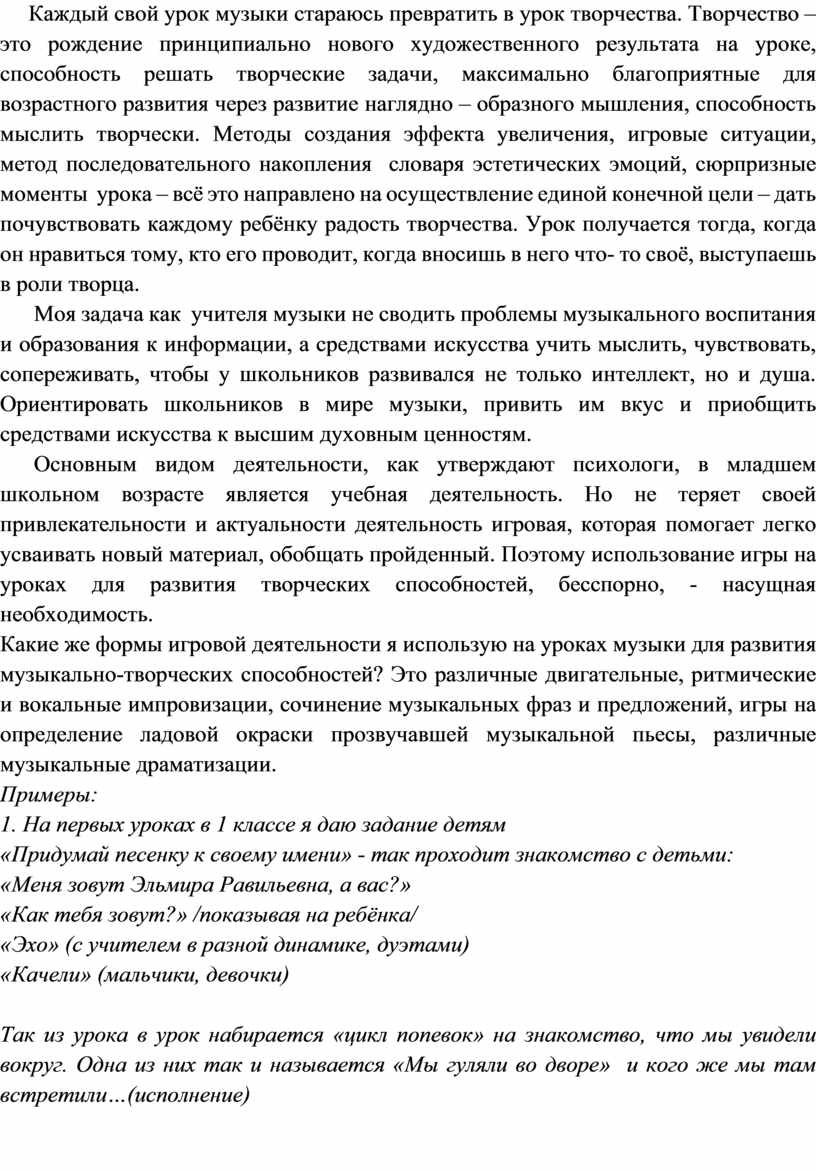 Каждый свой урок музыки стараюсь превратить в урок творчества. Творчество – это рождение принципиально нового художественного результата на уроке, способность решать творческие задачи, максимально благоприятные для возрастного развития через развитие наглядно – образного мышления, способность мыслить творчески. Методы создания эффекта увеличения, игровые ситуации, метод последовательного накопления словаря эстетических эмоций, сюрпризные моменты урока – всё это направлено на осуществление единой конечной цели – дать почувствовать каждому ребёнку радость творчества. Урок получается тогда, когда он нравиться тому, кто его проводит, когда вносишь в него что- то своё, выступаешь в роли творца.