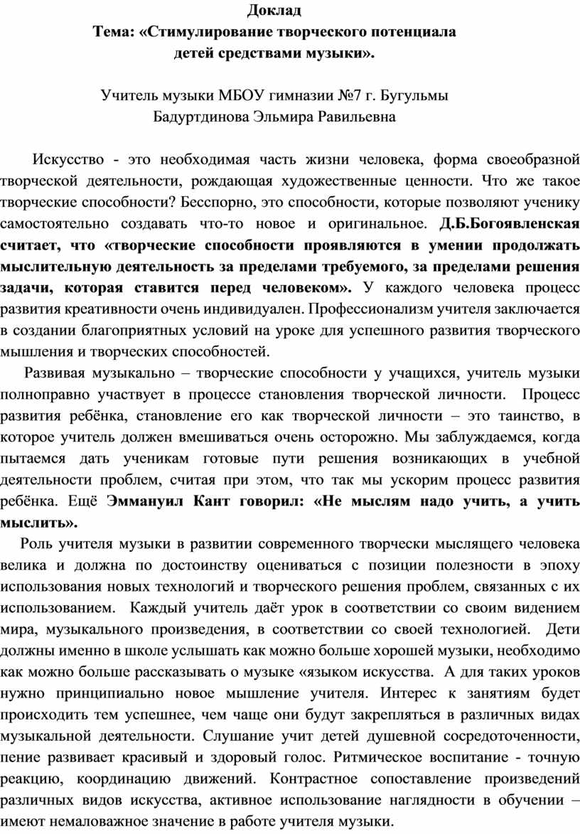 Развивая музыкально – творческие способности у учащихся, учитель музыки полноправно участвует в процессе становления творческой личности. Процесс развития ребёнка, становление его как творческой личности – это таинство, в которое учитель должен вмешиваться очень осторожно. Мы заблуждаемся, когда пытаемся дать ученикам готовые пути решения возникающих в учебной деятельности проблем, считая при этом, что так мы ускорим процесс развития ребёнка. Ещё Эммануил Кант говорил: «Не мыслям надо учить, а учить мыслить».