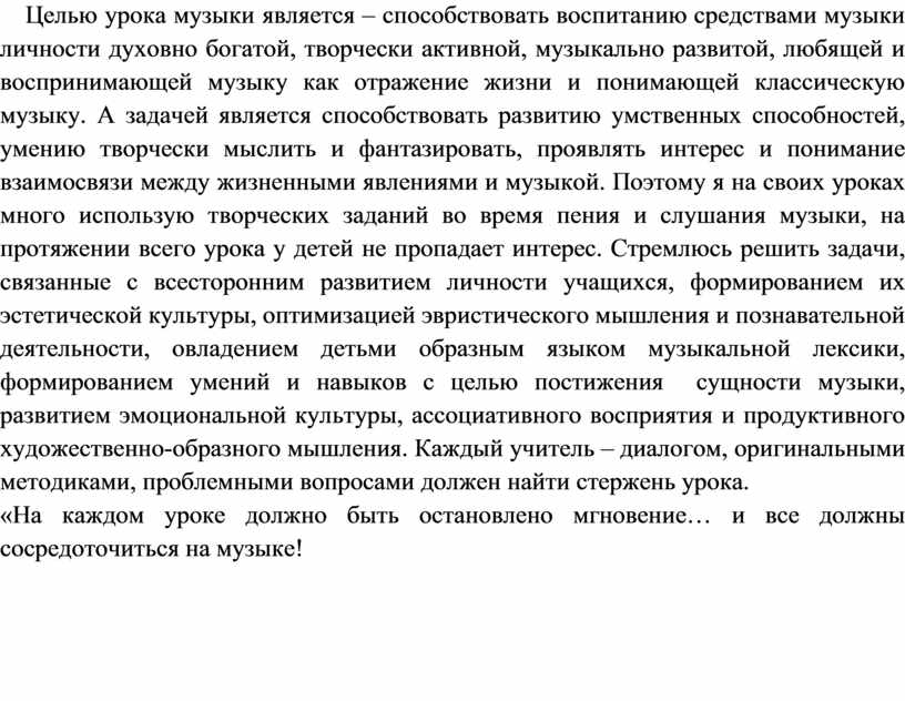 Целью урока музыки является – способствовать воспитанию средствами музыки личности духовно богатой, творчески активной, музыкально развитой, любящей и воспринимающей музыку как отражение жизни и понимающей классическую музыку. А задачей является способствовать развитию умственных способностей, умению творчески мыслить и фантазировать, проявлять интерес и понимание взаимосвязи между жизненными явлениями и музыкой. Поэтому я на своих уроках много использую творческих заданий во время пения и слушания музыки, на протяжении всего урока у детей не пропадает интерес. Стремлюсь решить задачи, связанные с всесторонним развитием личности учащихся, формированием их эстетической культуры, оптимизацией эвристического мышления и познавательной деятельности, овладением детьми образным языком музыкальной лексики, формированием умений и навыков с целью постижения сущности музыки, развитием эмоциональной культуры, ассоциативного восприятия и продуктивного художественно-образного мышления. Каждый учитель – диалогом, оригинальными методиками, проблемными вопросами должен найти стержень урока.