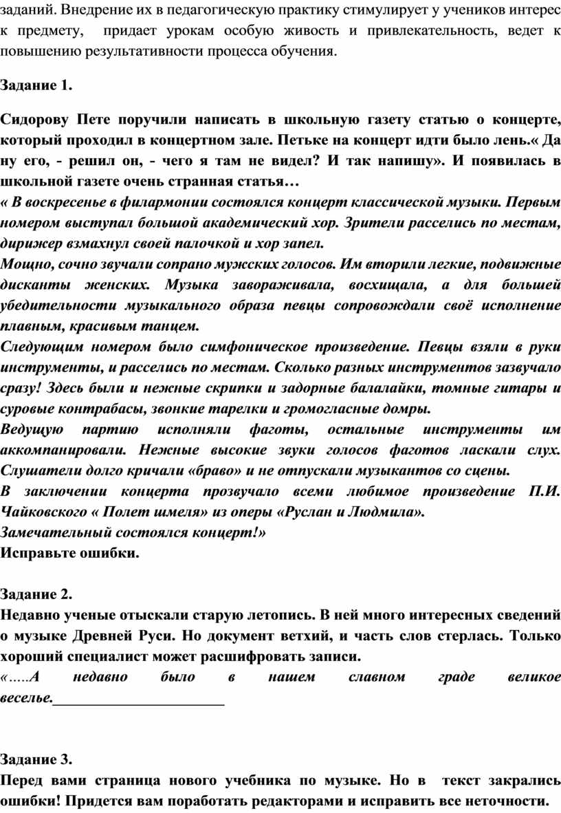 Перед вами страница нового учебника по музыке. Но в текст закрались ошибки! Придется вам поработать редакторами и исправить все неточности.