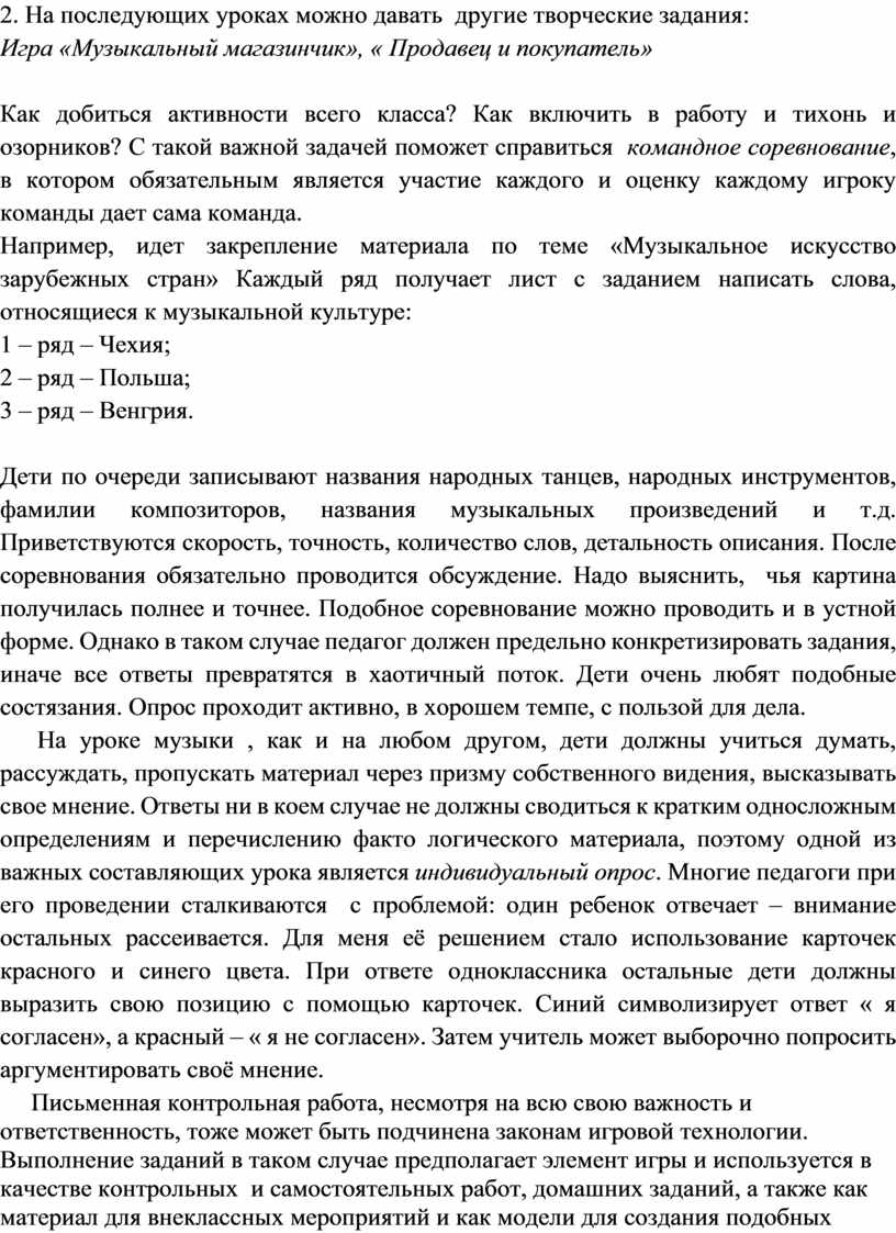 Например, идет закрепление материала по теме «Музыкальное искусство зарубежных стран» Каждый ряд получает лист с заданием написать слова, относящиеся к музыкальной культуре: