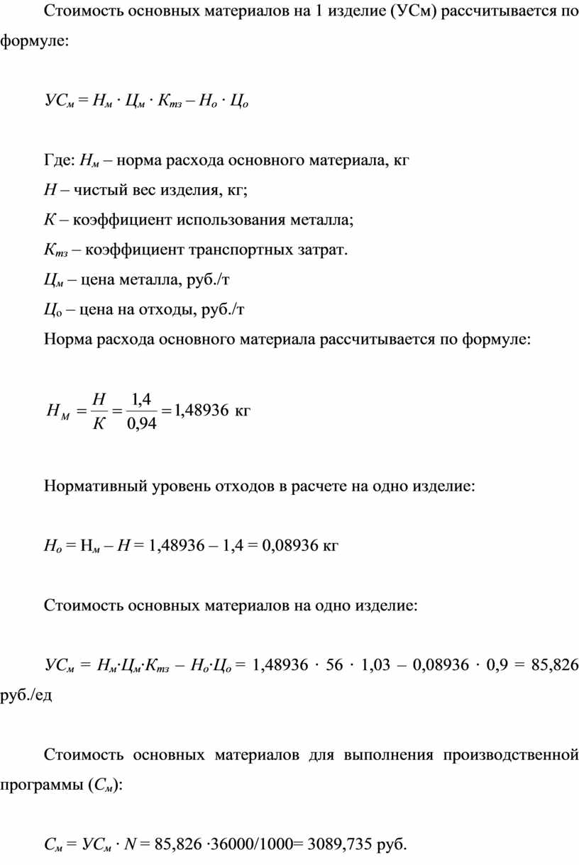 Стоимость основных материалов на 1 изделие (УСм) рассчитывается по формуле: