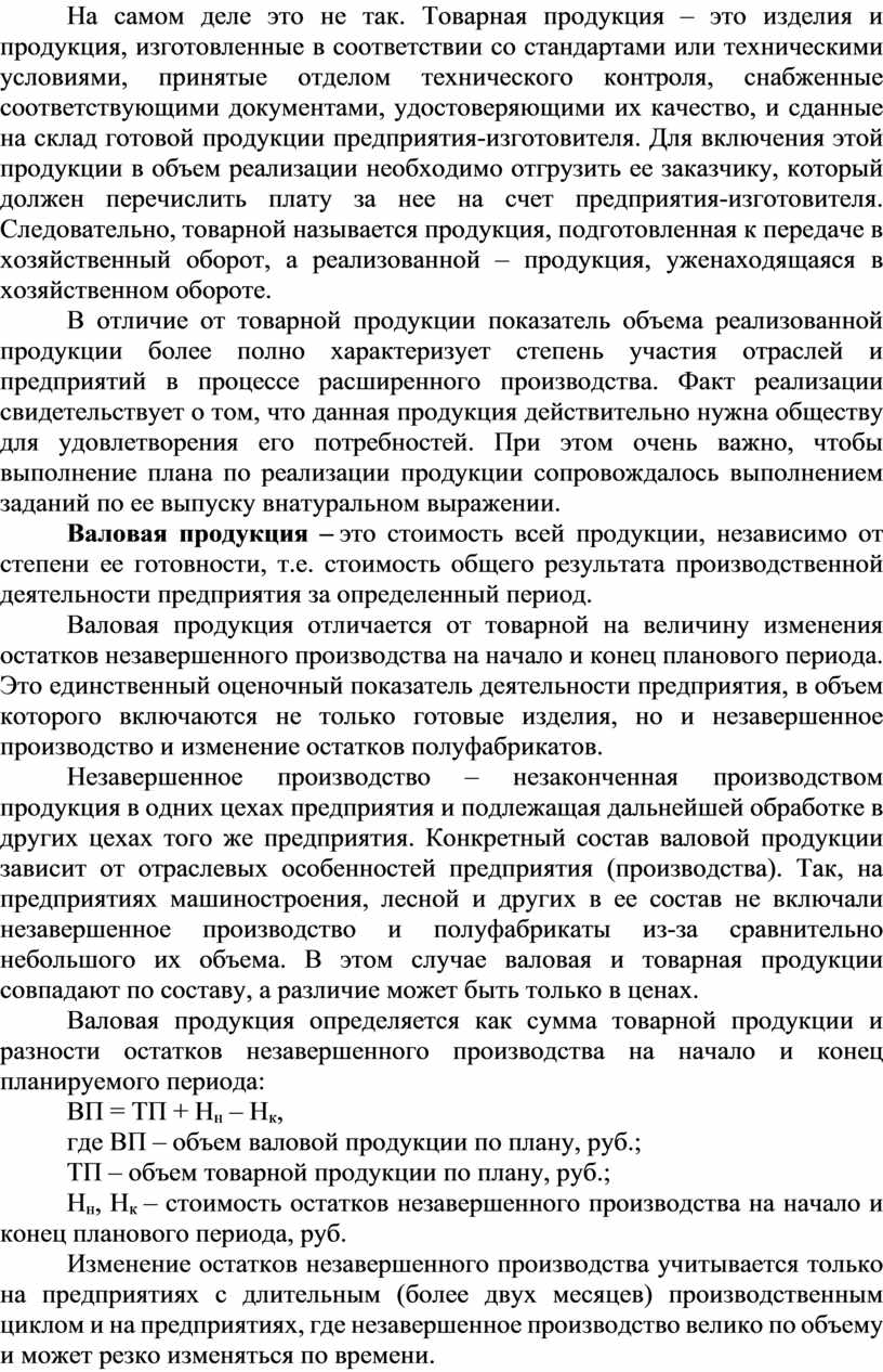 Валовая продукция отличается от товарной на величину изменения остатков незавершенного производства на начало и конец планового периода. Это единственный оценочный показатель деятельности предприятия, в объем которого включаются не только готовые изделия, но и незавершенное производство и изменение остатков полуфабрикатов.