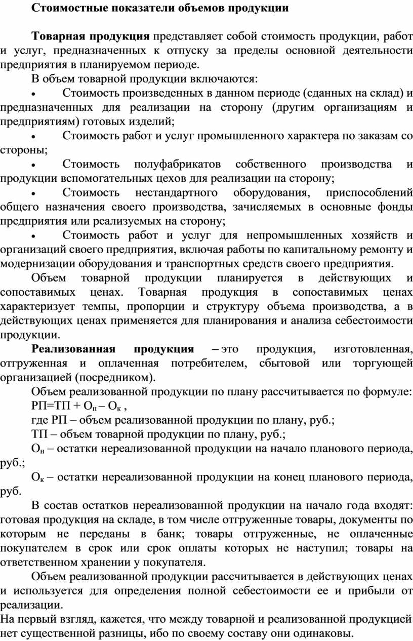 Объем реализованной продукции рассчитывается в действующих ценах и используется для определения полной себестоимости ее и прибыли от реализации.