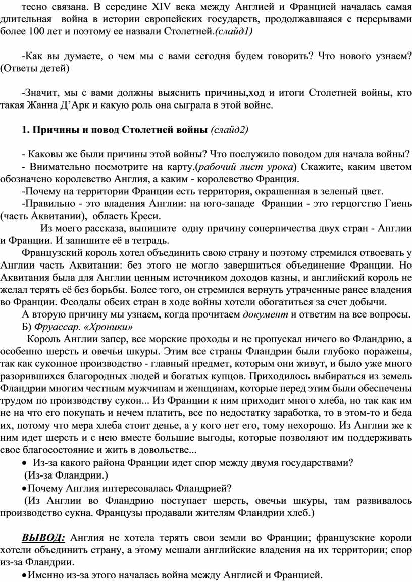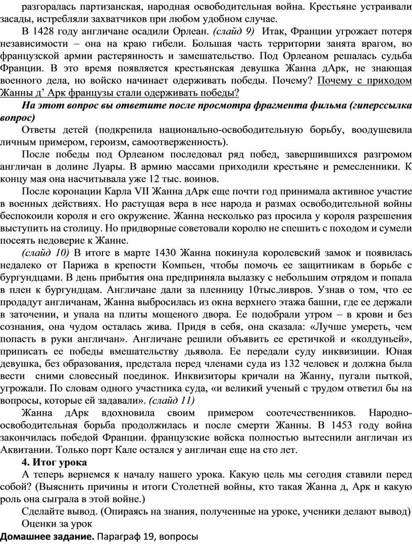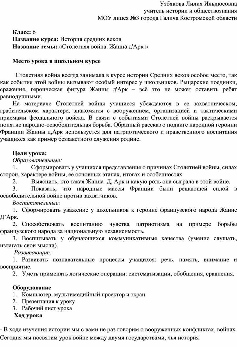 На материале Столетней войны учащиеся убеждаются в ее захватническом, грабительском характере, знакомятся с вооружением, организацией и тактическими приемами феодального войска. В связи с событиями Столетней войны раскрывается понятие народно-освободительная борьба. Образный рассказ о подвиге народной героини Франции Жанны д,Арк используется для патриотического и нравственного воспитания учащихся как пример беззаветного служения родине.
