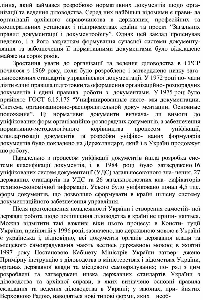 Зростання уваги до організації та ведення діловодства в СРСР почалося з 1969 року, коли було розроблено і затверджено низку зага- льносоюзних стандартів управлінської документації. У 1972 році по- чали діяти єдині правила підготовки та оформлення організаційно- розпорядчих документів і єдині правила роботи з документами. У 1975 році було прийнято ГОСТ 6.15.175 “Унифицированные систе- мы документации. Система организационно-распорядительной доку- ментации. Основные положения”. Ці нормативні документи визнача- ли вимоги до уніфікованих форм організаційно-розпорядчих документів, а забезпечення нормативно-методологічного керівництва процесом уніфікації, стандартизації документів та розробки уніфіко- ваних формулярів документів було покладено на Держстандарт, який і в Україні продовжує цю роботу.