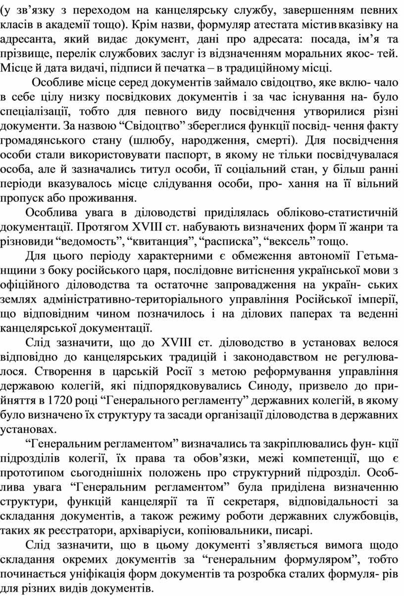 Слід зазначити, що до ХVІІІ ст. діловодство в установах велося відповідно до канцелярських традицій і законодавством не регулюва- лося. Створення в царській Росії з метою реформування управління державою колегій, які підпорядковувались Синоду, призвело до при- йняття в 1720 році “Генерального регламенту” державних колегій, в якому було визначено їх структуру та засади організації діловодства в державних установах.