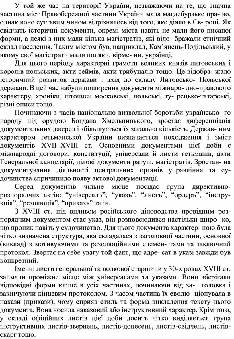 Слід зазначити, що в цьому документі з’являється вимога щодо складання окремих документів за “генеральним формуляром”, тобто починається уніфікація форм документів та розробка сталих формуля- рів для різних видів документів.