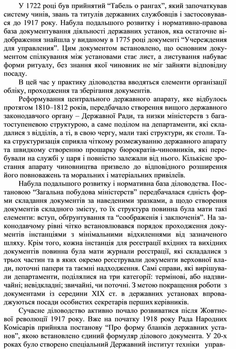 У 1722 році був прийнятий “Табель о рангах”, який започаткував систему чинів, звань та титулів державних службовців і застосовував- ся до 1917 року. Набула подальшого розвитку і нормативно-правова база документування діяльності державних установ, яка остаточне ві- дображення знайшла у виданому в 1775 році документі “Учереждения для управления”. Цим документом встановлено, що основним доку- ментом спілкування між установами стає лист, а листування набуває форми ритуалу, без знання якої чиновник не міг зайняти відповідну посаду.