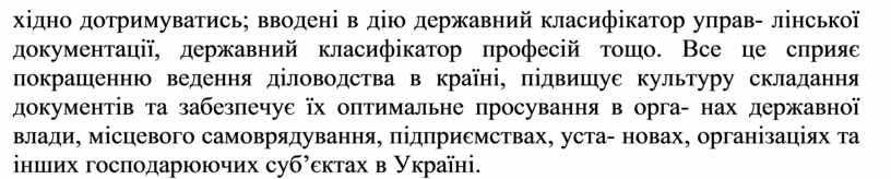 хідно дотримуватись; вводені в дію державний класифікатор управ- лінської документації, державний класифікатор професій тощо. Все це сприяє покращенню ведення діловодства в країні, підвищує культуру складання документів та забезпечує їх оптимальне просування в орга- нах державної влади, місцевого самоврядування, підприємствах, уста- новах, організаціях та інших господарюючих суб’єктах в Україні.