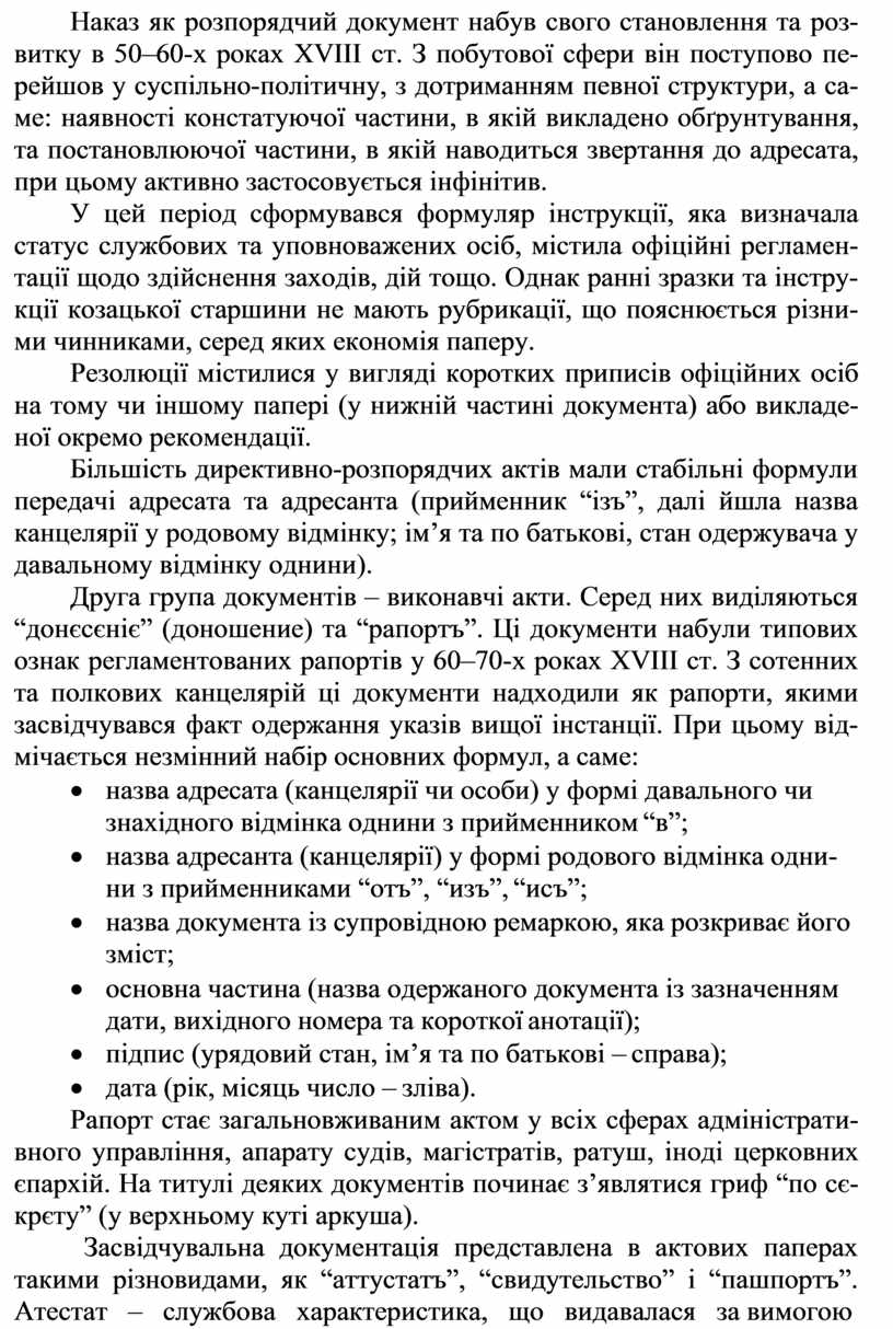 Наказ як розпорядчий документ набув свого становлення та роз- витку в 50–60-х роках ХVІІІ ст. З побутової сфери він поступово пе- рейшов у суспільно-політичну, з дотриманням певної структури, а са- ме: наявності констатуючої частини, в якій викладено обґрунтування, та постановлюючої частини, в якій наводиться звертання до адресата, при цьому активно застосовується інфінітив.