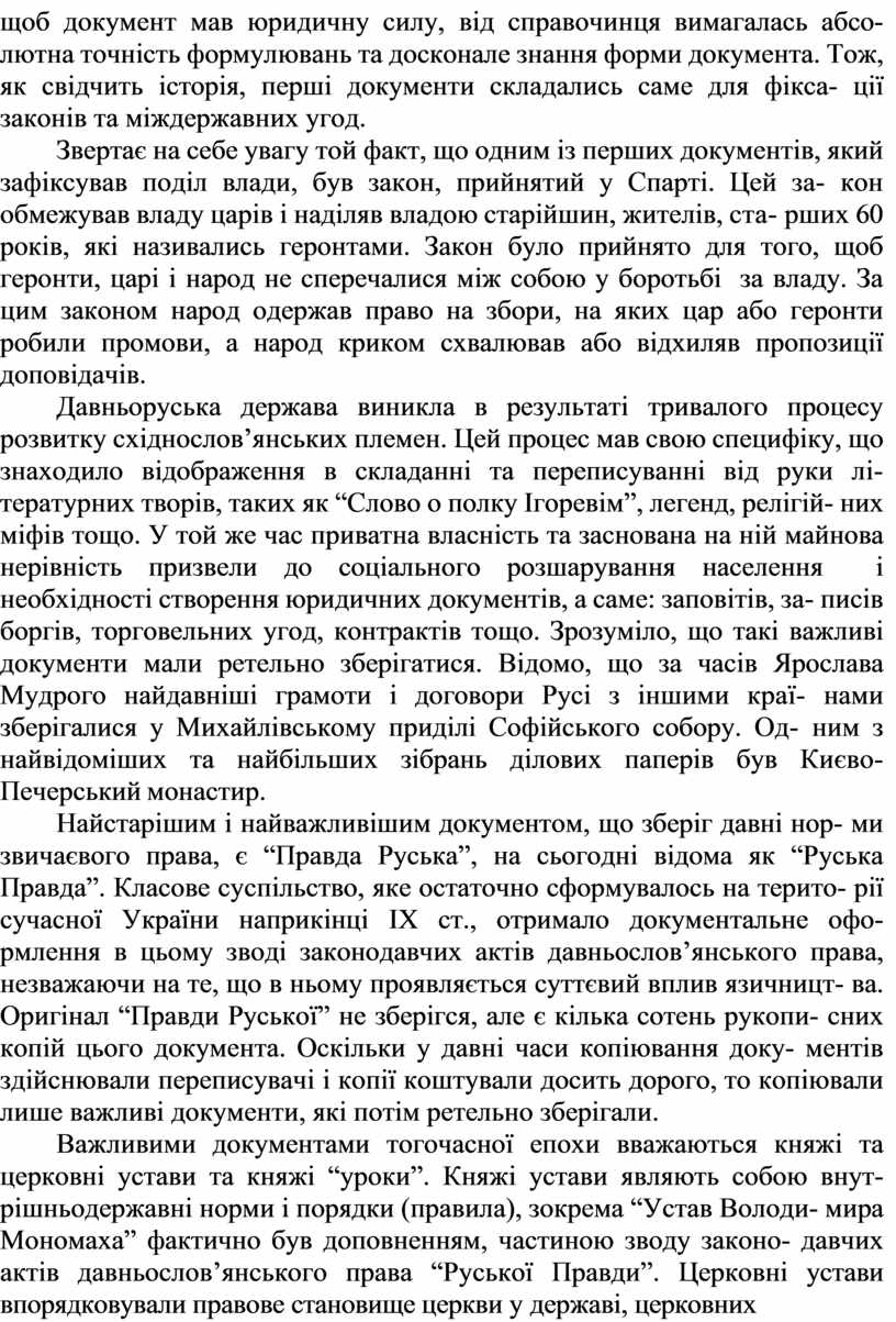 щоб документ мав юридичну силу, від справочинця вимагалась абсо- лютна точність формулювань та досконале знання форми документа. Тож, як свідчить історія, перші документи складались саме для фікса- ції законів та міждержавних угод.