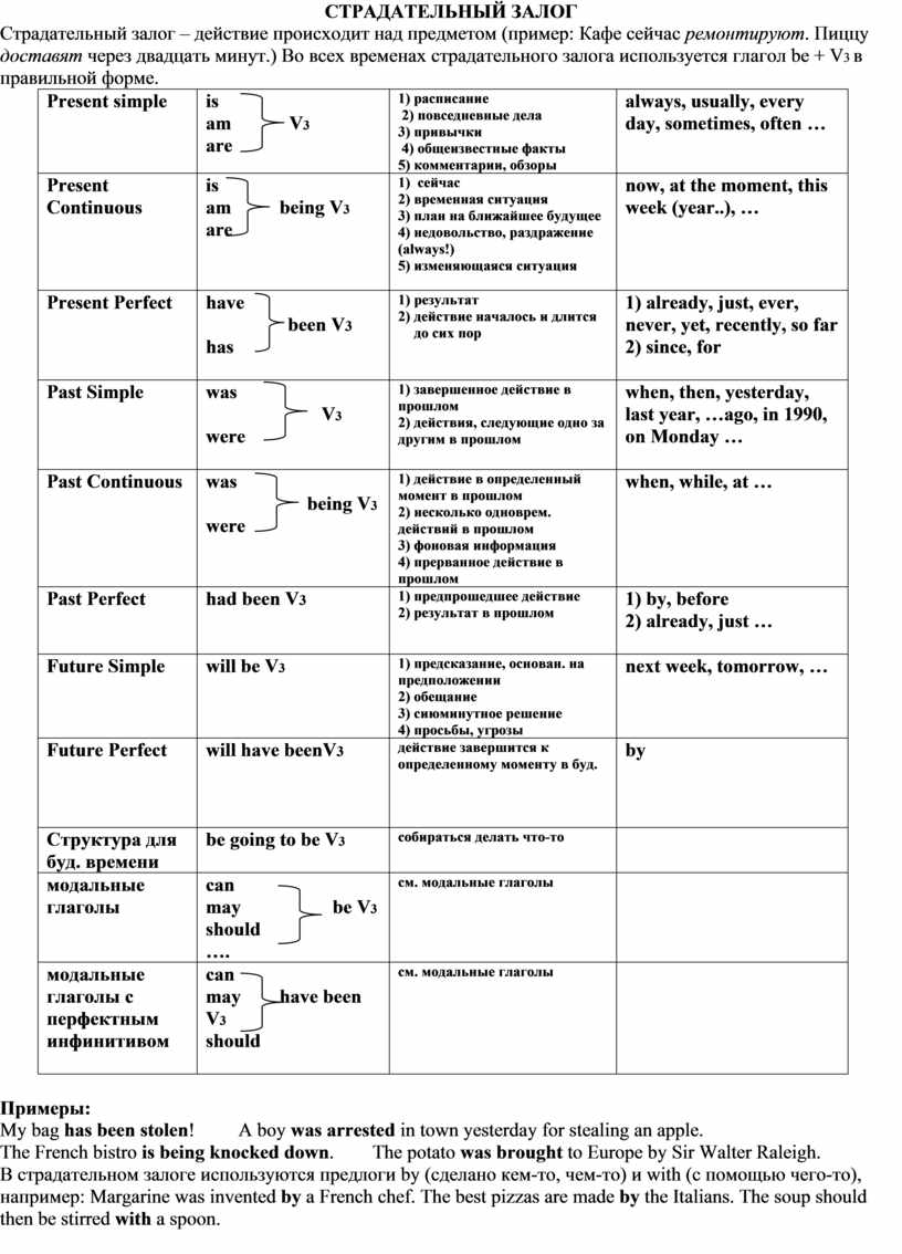 Страдательный залог – действие происходит над предметом (пример: Кафе сейчас ремонтируют. Пиццу доставят через двадцать минут.) Во всех временах страдательного залога используется глагол be + V3 в правильной форме.