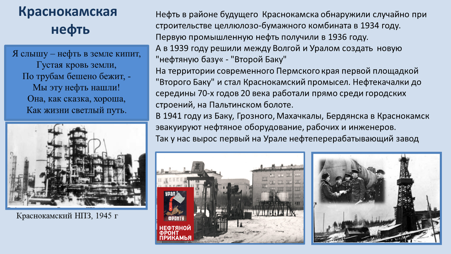 А в 1939 году решили между Волгой и Уралом создать новую "нефтяную базу« - "Второй Баку" На территории современного Пермского края первой площадкой "Второго Баку" и стал Краснокамский промысел. Нефтекачалки до середины 70-х годов 20 века работали прямо среди городских строений, на Пальтинском болоте.